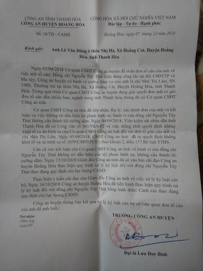 Ngày 07/12/2018, Đại tá Lưu Huy Bình (Trưởng Công an huyện Hoằng Hóa) ký Văn bản số 18/TB-CAHH thông báo kết quả xử lý kỷ luật cán bộ có liên quan đơn tố cáo của anh L.V.D. Theo văn bản này, ngày 16/10/2018, Công an huyện Hoằng Hóa đã tiến hành thực hiện quy trình xử lý kỷ luật đối với Thượng úy Nguyễn Túy Thái bằng hình thức: “Cảnh cáo”. Vì sao Thượng úy Nguyễn Túy Thái chỉ bị kỷ luật cảnh cáo?