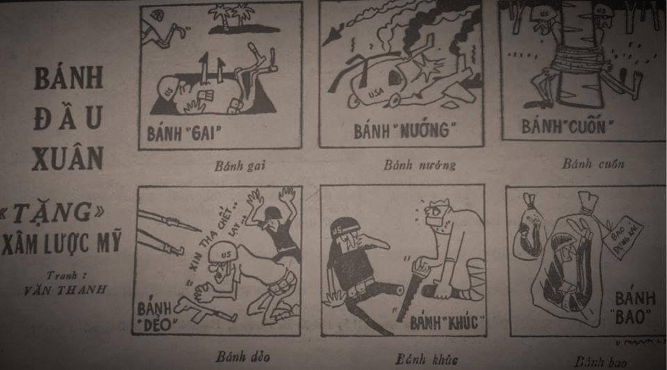 Việt Cộng đã gửi tặng những loại bánh nào cho Mỹ nhân dịp tết. Biếm họa Tết trên báo Tiền phong VC đầu thập niên 1970.
