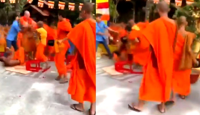 Clip cho thấy nhóm 4 - 5 sư chùa cầm ghế và tô đánh nhau quyết liệt. Thậm chí có chiếc ghế nhựa bị đập gãy.
