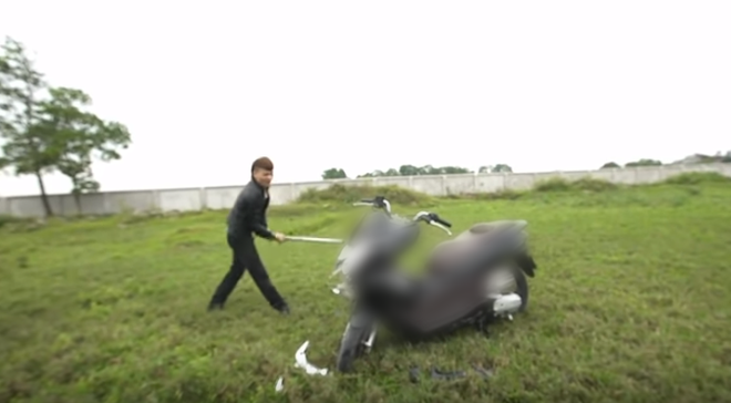 Trước đó, Khá Bảnh còn vô tư đăng tải đoạn clip cảnh mình đập nát và đốt trơ khung một chiếc xe máy. Theo dõi đoạn clip cho thấy, Khá Bảnh cùng một thanh niên khác dùng gậy sắt đập nát chiếc xe máy. Lý do được nam thanh niên này đưa ra là do chiếc xe này tốn xăng.