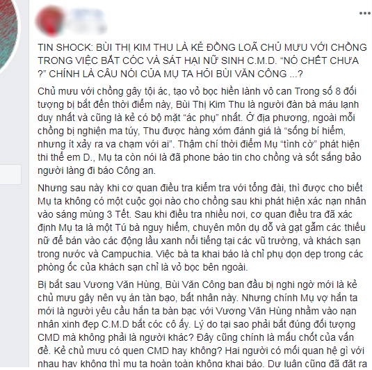 Người này còn đăng Bùi Kim Thu được cho là kẻ “đầu sỏ” cho mọi tội ác và tất cả những nội dung trên đều được “cơ quan điều tra” cung cấp. Thậm chí còn nêu rõ chi tiết Thu gọi điện cho chồng nói “nó chết chưa?”...