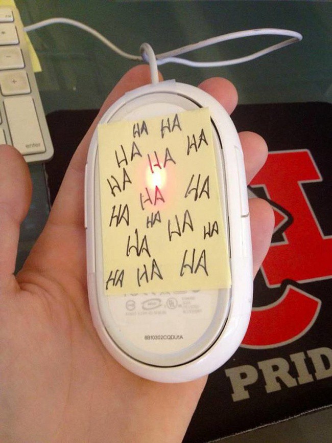 Với đồng nghiệp cần ý tứ hơn thì đùa vui vẻ chút, đơn giản là dán tờ giấy như thế này xuống dưới con chuột rồi nhìn họ sống chết tìm xem hỏng hóc chỗ nào.