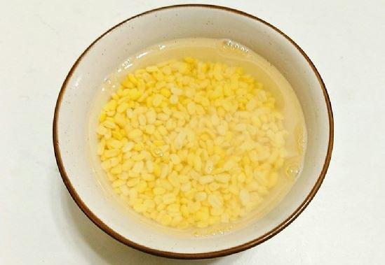 - Ngâm trong nước ít nhất 2-3 tiếng hoặc có thể ngâm qua đêm để đậu nở, những hạt đậu xanh nào nổi lên thì vớt bỏ đi vì chúng bị hỏng.