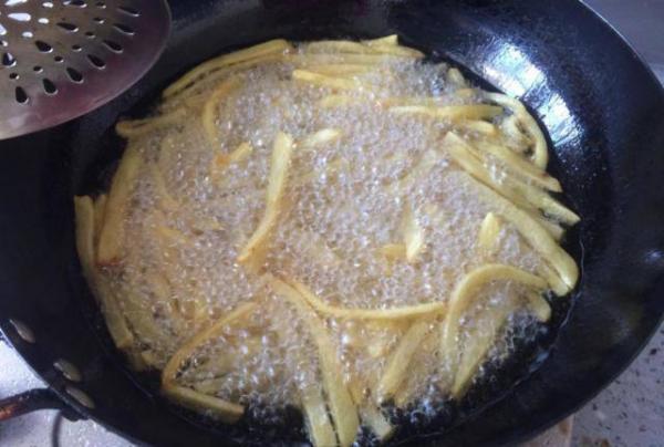 Sau đó, thả ngay khoai tây vào chảo, chiên cho đến khi khoai có màu hơi vàng, vớt ra rổ có lót sẵn giấy thấm dầu.