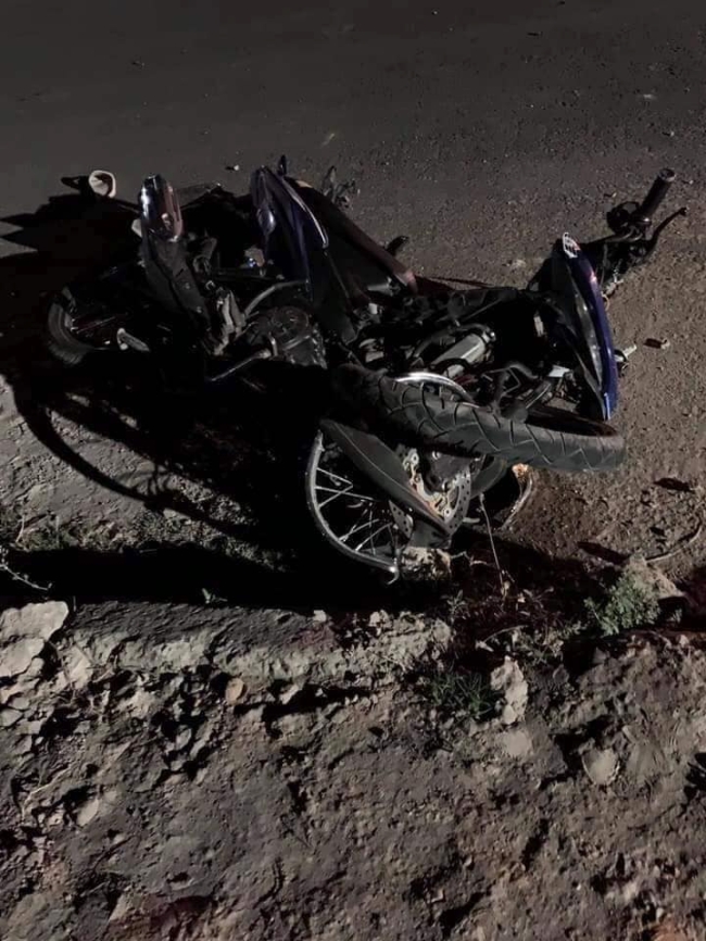 Cú va chạm mạnh khiến hai xe máy bể nát, lốp chiếc Exciter của thanh niên gây tai nạn văng ra khỏi mâm.