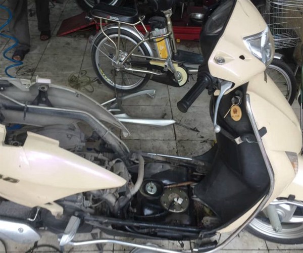 Chiếc xe máy được tháo ra để kiểm tra.
