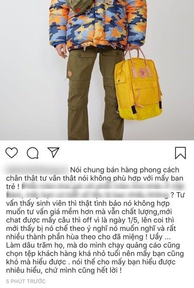 Mạc Yên: Có người nghề nghiệp đề sinh viên nhưng đứng tên sổ đỏ nhà mặt phố, lãi tài khoản gửi ngân hàng đủ để mua đồ hiệu đem vứt xó tủ rồi đó. Đâu phải học sinh sinh viên nào cũng nghèo, mà nghèo nhưng nhà nó giàu thì sao. Shop nói vậy sao được?