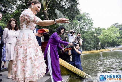 Sau hội đàm, Phó Chủ tịch nước Đặng Thị Ngọc Thịnh và Công chúa kế vị Thụy Điển đã đến thăm ao cá và nhà sàn Bác Hồ trong Phủ Chủ tịch.