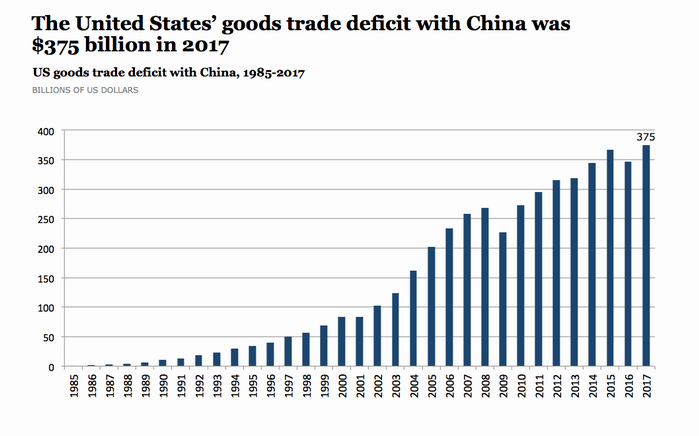 H́nh thâm hụt thương mại Mỹ-Trung 1985-2017, năm 2018 thâm hụt là 420 tỷ USD, năm 2019 dự kiến là 465 tỷ USD.