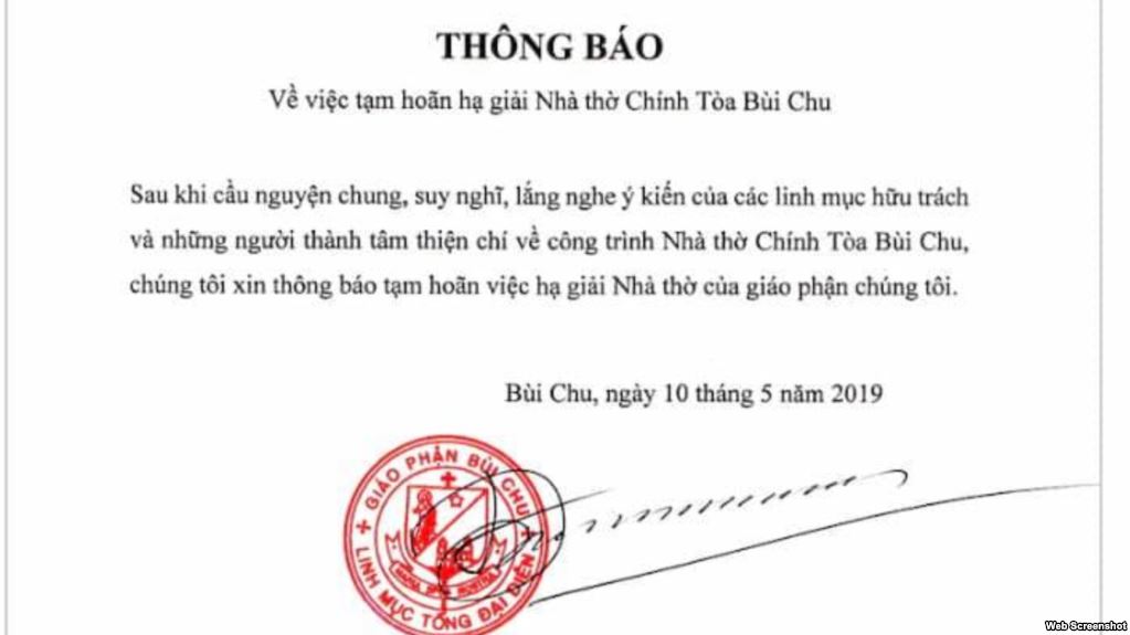 Linh mục Nguyễn Đức Giang, Trưởng ban Xây dựng Nhà thờ Chính tòa Bùi Chu, cho biết trong một thông cáo hôm 10/5: “Sau khi cầu nguyện chung, lắng nghe ý kiến của các linh mục hữu trách và những người thành tâm thiện chí về công trình Nhà thờ chính tòa Bùi Chu, Ban Xây dựng nhà thờ quyết định tạm hoãn việc hạ giải nhà thờ.”