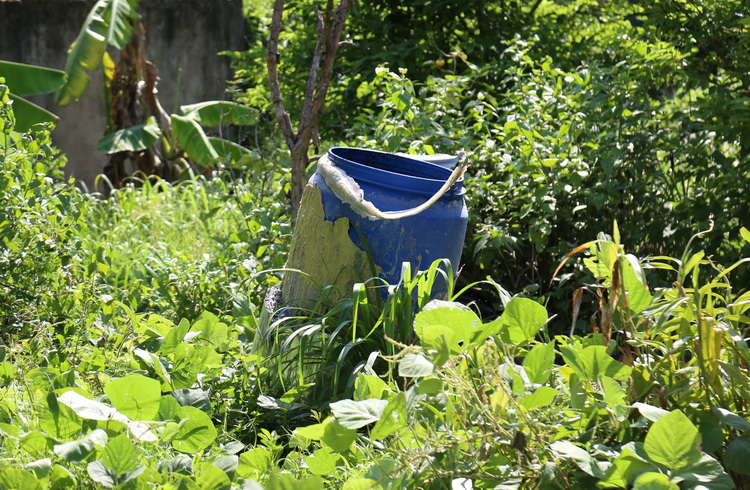 Bình nhựa mà nhóm nghi can dùng để ướp xác nạn nhân nằm trong vườn căn nhà ở xã Hưng Hòa. Ảnh: Phước Tuấn.