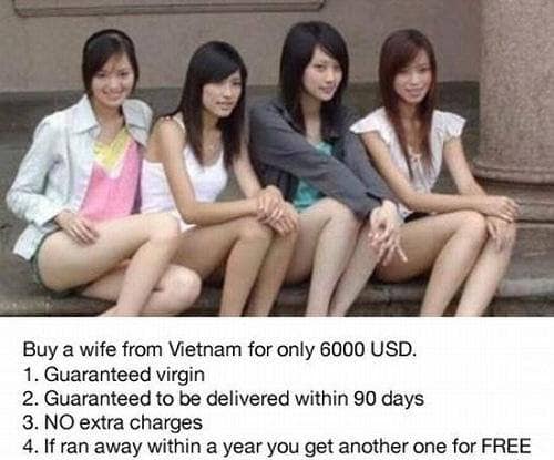 Trên internet của Nam Hàn, Tàu cộng rao bán cô dâu Việt Nam như bán trái dưa trái cà, con cá con gà. Trái dưa hư thì đổi cho trái khác, con gà mà xổng chạy mất thì đền cho con khác. Gà còn trinh.