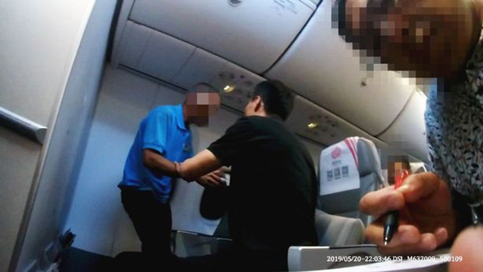 Người đàn ông mặc áo xanh gây rối trên chuyến bay của Fuzhou Airlines hôm 20/5. Ảnh: AsiaWire.