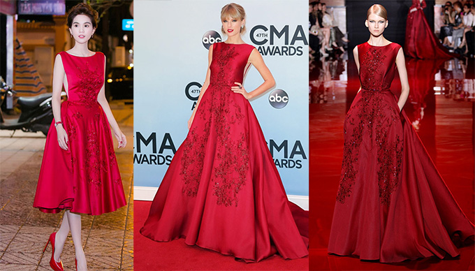 Ngọc Trinh mặc váy nhái thương hiệu Elie Saab mà ca sĩ Taylor Swift từng diện.