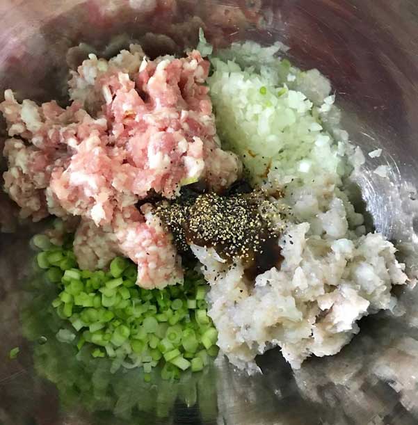 Trộn tôm băm nhuyễn với thịt xay, thêm một thìa cà phê dầu hào, một thìa cà phê bột nêm, chút hạt tiêu, một thìa cà phê dầu mè, hành tây băm nhỏ, trộn thật đều để gia vị ngấm.
