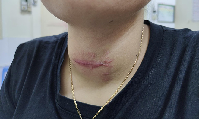 Vùng cổ bệnh nhân có vết sẹo chằng chịt sau khi được thầy lang điều trị. Ảnh: Bệnh viện cung cấp.