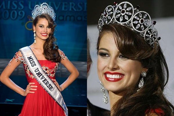 Trước đó, Miss Universe 2007 Riyo Mori năm 2007 cũng thường xuyên sử dụng vương miện bản sao (phải) sau khi đăng quang. Tất cả hoa hậu đều được ban tổ chức trao món quà này như một phần thưởng để giữ lại sau khi kết thúc nhiệm kỳ.