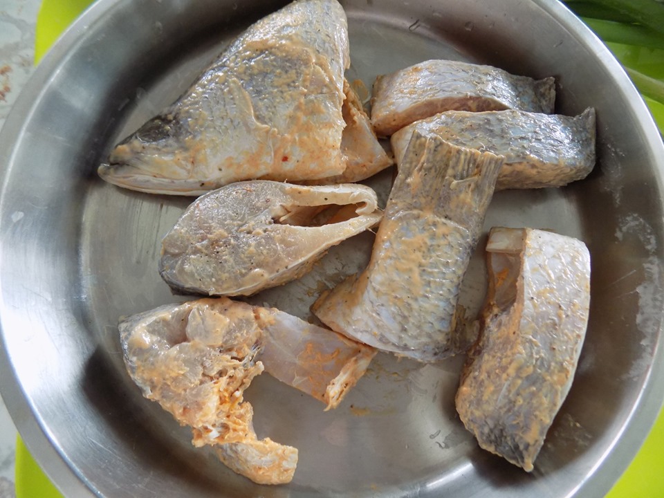Bước 2: Cá làm và rửa sạch, cắt miếng vừa ăn. Ướp vào cá chút muối và tiêu, sau đó cho bột chiên giòn vào áo đều.