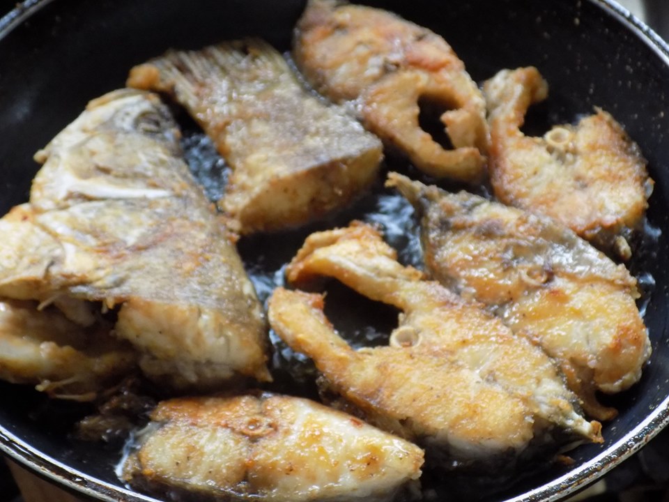 Bước 3: Bắt chảo lên bếp, cho vào khoang 100 ml dầu, chờ dầu hơi nóng thì cho từng ít cá vào chiên với lửa vừa. Chiên cá vàng giòn 2 mặt trước khi gắp ra đĩa.