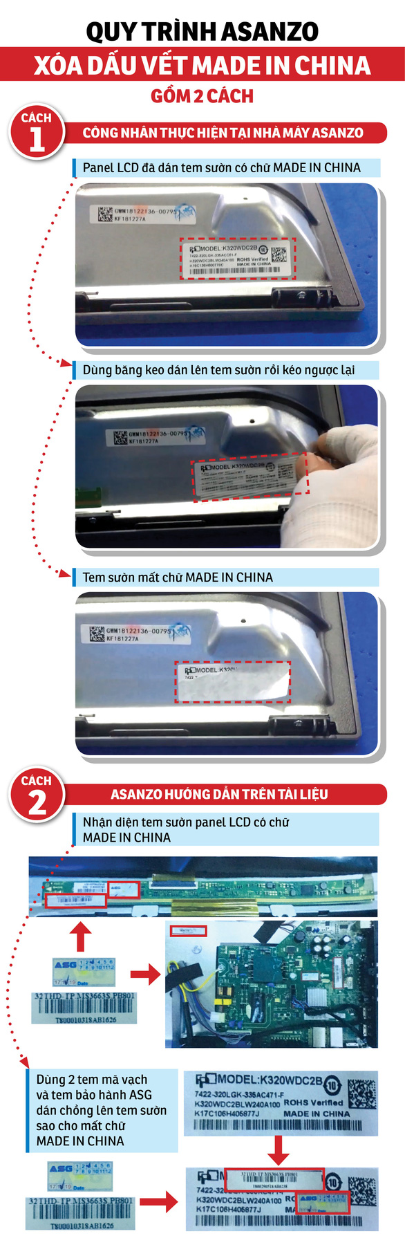 Theo tài liệu hướng dẫn quy trình lắp ráp của Asanzo, công nhân đứng tại vị trí số 3 có nhiệm vụ xóa dấu vết chữ "made in China". Người này sẽ dán tem trên panel, bảng mạch và tem sườn trước khi gắn nắp lưng.
