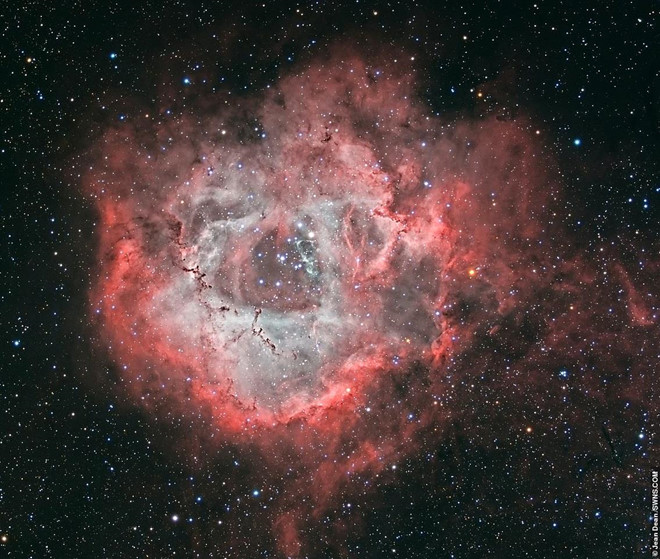 Tinh vân Rosette trong chòm sao Monoceros, cách chúng ta khoảng 5.000 năm ánh sáng và rộng khoảng 115 năm ánh sáng. Bên trong tinh vân là một cụm sao sáng chói hình thành cách đây khoảng bốn triệu năm.