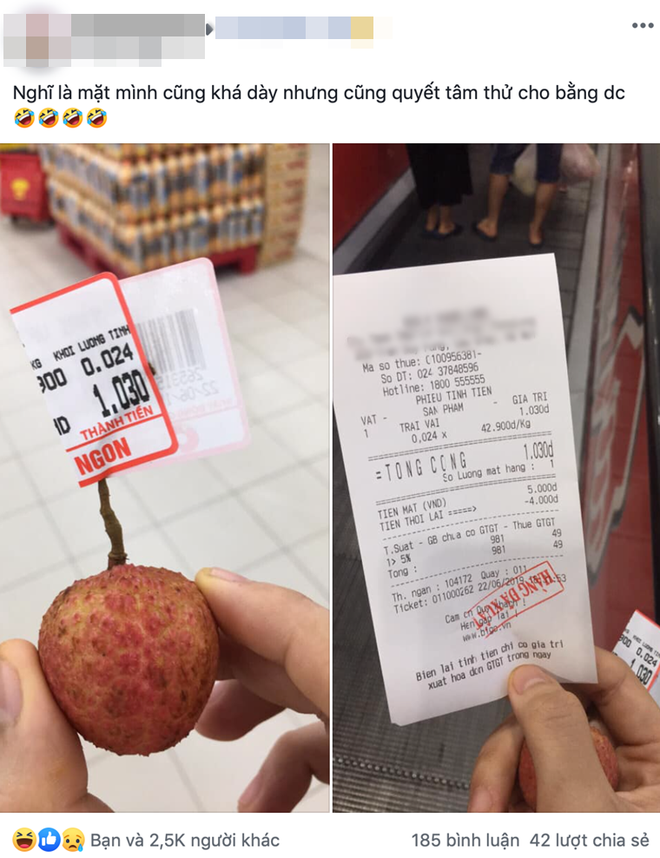 "Nghĩ là mặt mình cũng khá dày nên cũng quyết tâm thử cho bằng được" - anh chàng này chia sẻ ngắn gọn. V.T.M còn chụp ảnh quả vải được đích thân anh chàng lựa chọn và tờ hóa đơn làm bằng chứng khiến nhiều người phải phì cười.
