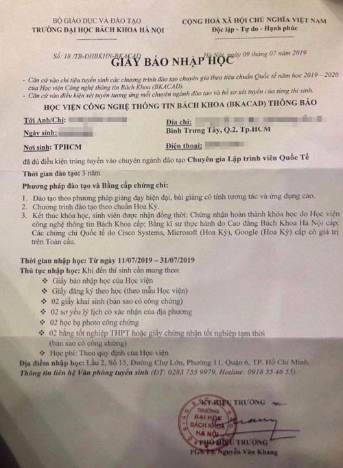 Giấy báo nhập học có nội dung Học viện Công nghệ Thông tin Bách khoa (BKACAD) thông báo thí sinh đủ điều kiện trúng tuyển vào chuyên ngành đào tạo chuyên gia lập trình viên quốc tế. Thời gian đào tạo 3 năm, hoàn thành khóa học sẽ nhận bằng kỹ sư thực hành do Trường CĐ Bách khoa Hà Nội cấp.