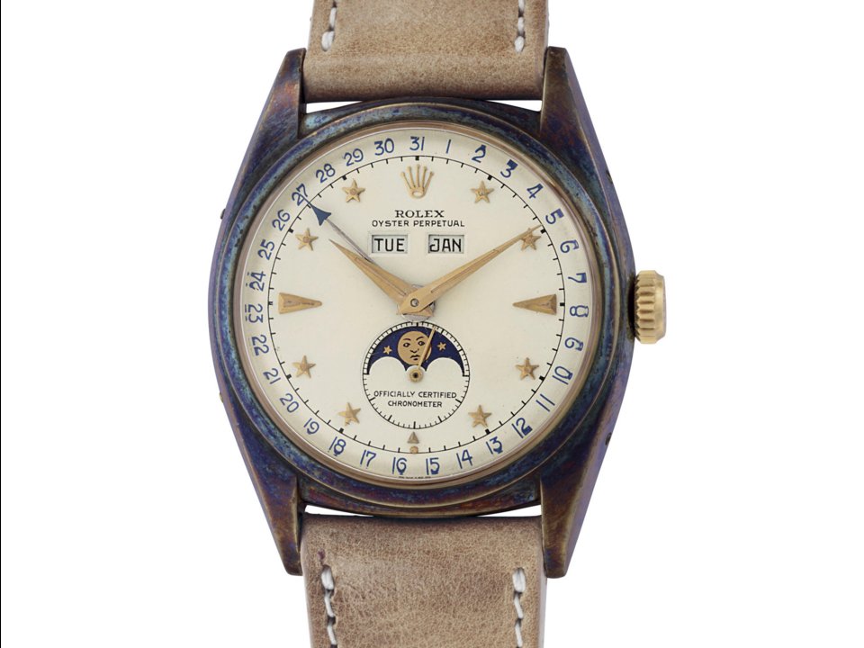 Một đồng hồ bấm giờ được chứng nhận chính thức, Rolex vàng 18K với lịch ba, mặt số sao và các giai đoạn mặt trăng, chiếc đồng hồ này đã chứng tỏ là một cú đầu tư chuẩn xác của người mua nó đầu tiên khi mang về 1,572 triệu đô la (khoảng hơn 36 tỷ đồng).