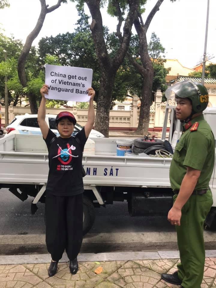 Trong một tấm hình trên trang Facebơok của Facebooker Nguyễn Thúy Hạnh, người ta thấy bà giơ cao tấm biểu ngữ “China get out of Vietnam’s Vanguard Bank” (Trung Quốc cút khỏi bãi Tư Chính của Việt Nam).