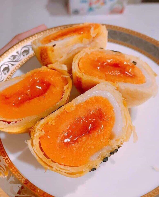 Trên các trang mạng xã hội, bánh trung thu này được quảng cáo là loại bánh ngàn lớp. Trong đó, lớp vỏ thơm giòn, lớp 2 mochi dẻo ngậy, lớp 3 nhân custard, cuối cùng là nhân trứng chảy tràn thơm ngon, đậm vị...