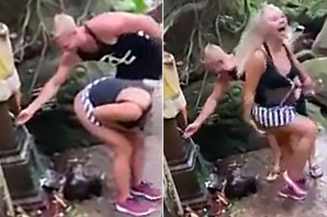 Đoạn clip ngắn quay tại đền Beji nằm trong Khu bảo tồn Rừng Khỉ, thuộc làng Padangtegal, đảo Bali, cho thấy cặp đôi này cười khúc khích khi đứng gần một đài phun nước. Sau đó, cô gái tên Dolezalova vén váy của mình lên và cúi người xuống, trong khi bạn trai Slouka hứng nước thiêng từ vòi và hất vào phía sau hông cô, khiến cô kêu lên.