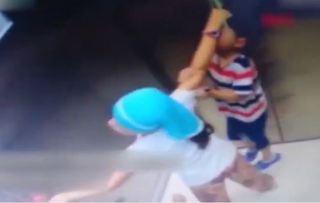 Chỉ ít giây sau khi thang máy đi xuống, bé trai đã bị sợi dây kéo lên trong tư thế giống như bị treo cổ cực kỳ nguy hiểm.