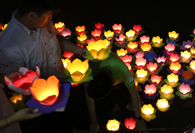Đông đảo người dân cùng phật tử dự lễ Vu Lan và thả đèn hoa đăng xuống sông Sài Gòn.
