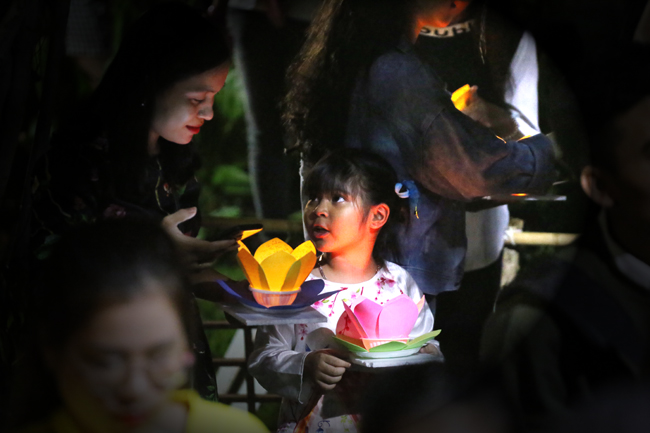 Nhiều em nhỏ được cha mẹ cho đi dự lễ Vu Lan và thả đèn hoa đăng.