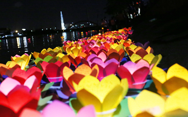 Đèn hoa đăng được thắp sáng kèm lời cầu chúc rồi thả xuống sông Sài Gòn trôi theo dòng nước.