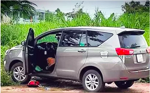 Hiện trường được phát hiện nằm trong khu dân cư gần Trung tâm hành chính huyện Vĩnh Thạnh, Cần Thơ, hôm 25/8. Trên ôtô, cảnh sát thu giữ hai chai thuốc sâu, trong đó có một chai đã cạn và một con dao.