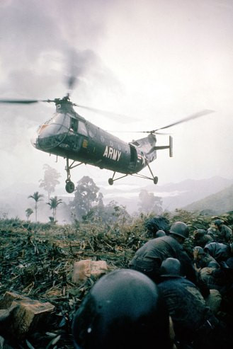 Trực thăng H-21 của Mỹ đáp xuống để đón lính bị thương trong một trận chiến với quân Giải phóng.