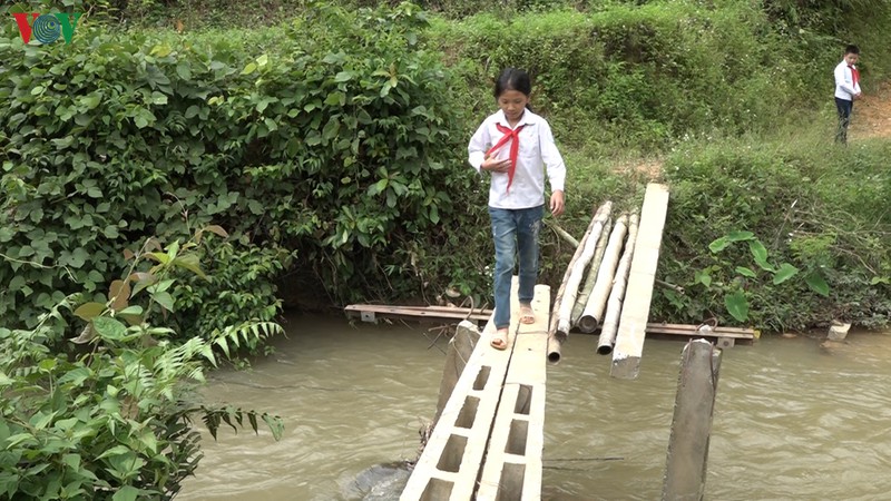 Các em phải băng qua suối để tới trường bằng những cây cầu tạm.