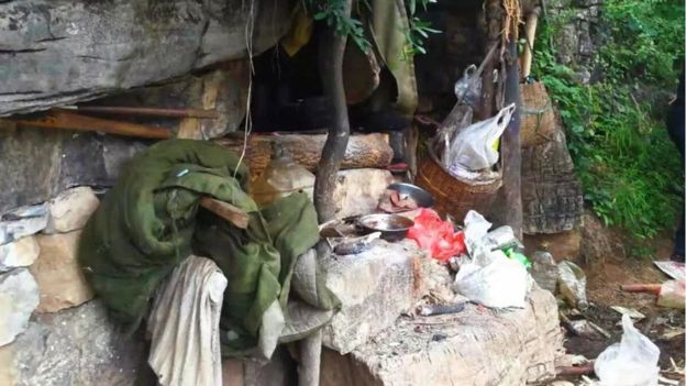 Cảnh sát huyện Vĩnh Thiện phát hiện miệng hang Song dùng để ẩn nấp khi dùng máy bay không người lái quan sát dọc sườn núi, nhà chức trách thông báo trên Weibo hôm 27/9.