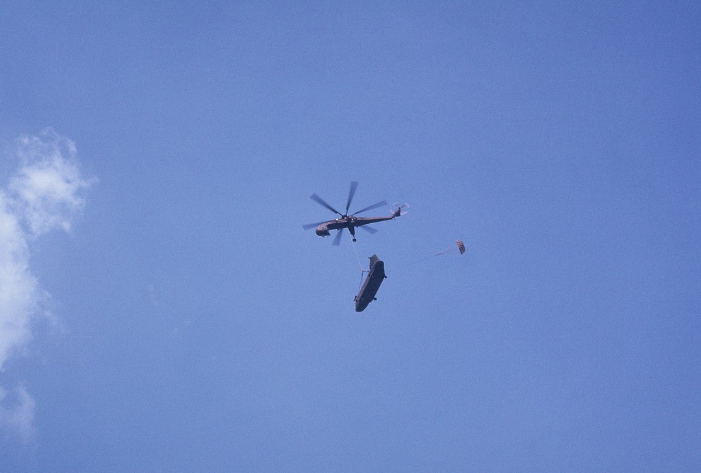 Trực thăng vận tải CH-54 của Mỹ tải một chiếc trực thăng CH-47 bị hỏng về sân bay để sửa chữa. Ảnh: Avel South.