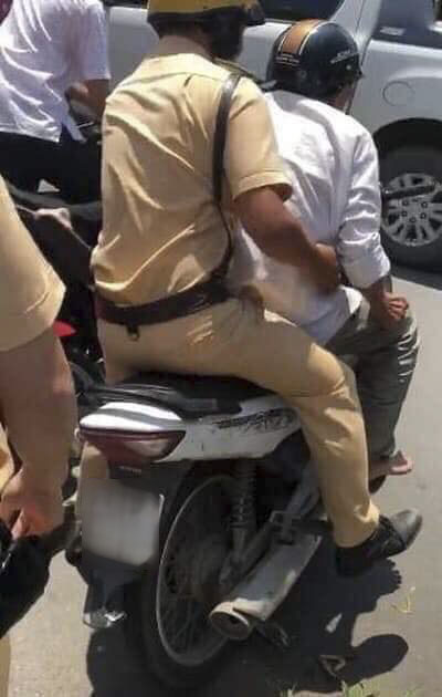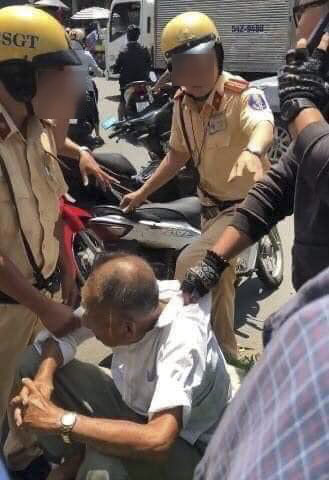 Cụ ông chở một chiến sĩ CSGT và tang vật về trụ sở.