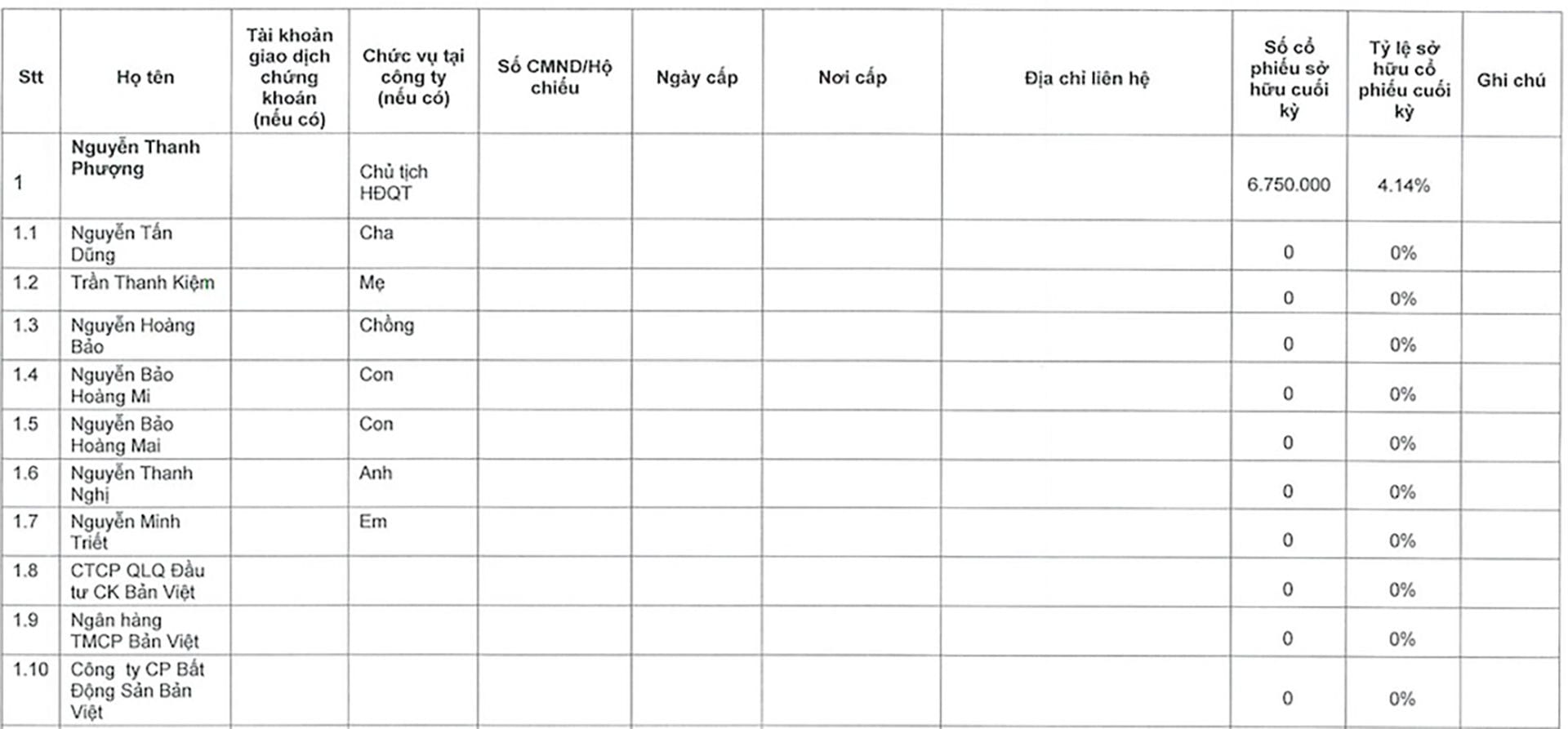 Không hề thấy trước đây có bản “báo cáo tài chính” nào của chứng khoản Bản Việt và các công ty kia của bà Nguyễn Thanh Phượng công bố danh sách cổ đông và số cổ phiếu của họ nắm giữ để người ta biết cha mẹ và anh em của bà có bao nhiêu phần trăm cổ phần trong đó.