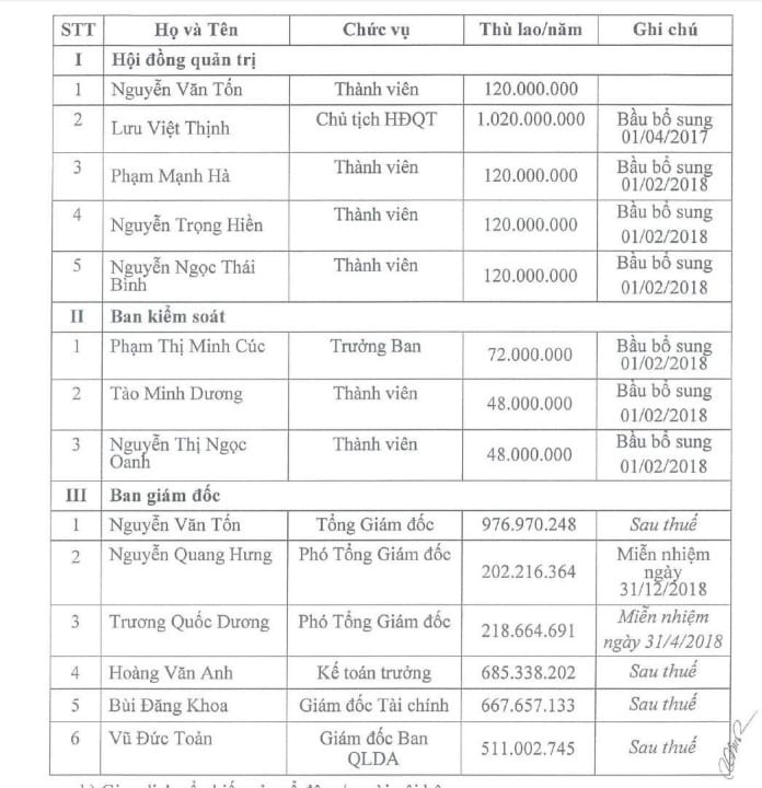 Chủ tịch HĐQT Lưu Việt Thịnh nhân lương hơn 1 tỷ đồng/năm; Phó Tổng giám đốc Nguyễn Quang Hưng nhận hơn 202 triệu đồng/năm; Phó Tổng giám đốc Trương Quốc Dương nhận hơn 218 triệu đồng/năm.