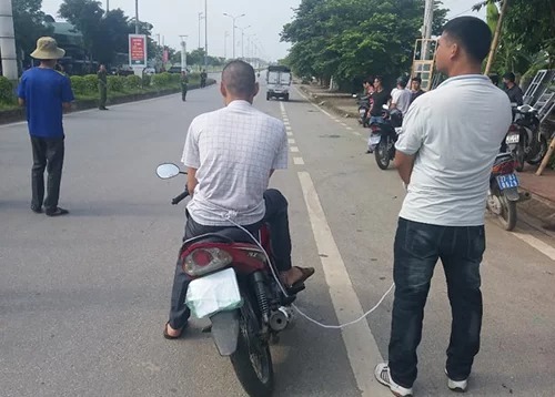 Toán thực nghiệm cảnh ngồi trên xe máy nhìn đồng bọn bắt cóc thiếu nữ giao gà. Ảnh: Thu Trang.