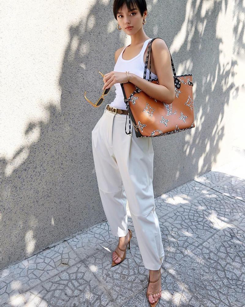 Khánh Linh tận hưởng ngày trời nắng đẹp với bộ đồ street style phóng khoáng. Diện trang phục tuyền trắng, quý cô thời trang khéo tạo điểm sáng bằng loạt phụ kiện có cùng tông màu nâu, mix ăn ý từ thắt lưng, túi xách tới sandals đồng điệu.