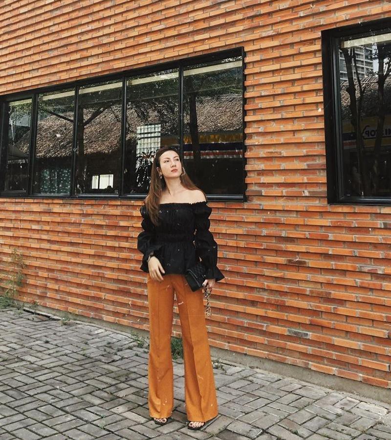 Yến Nhi “phiêu” trên phố thu với chiếc áo trễ vai bèo nhún điệu đà, điểm sắc giao mùa là chiếc quần ống loe màu vàng nâu, tạo sự tương phản màu sắc ấn tượng.