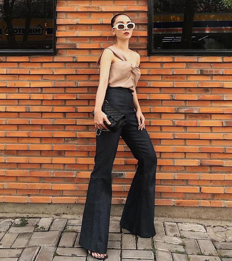 Chung ý tưởng diện quần ống loe, Yến Trang lựa chọn thiết kế cạp cao và áo lệch vai, để lộ “điểm vàng” hút mắt.
