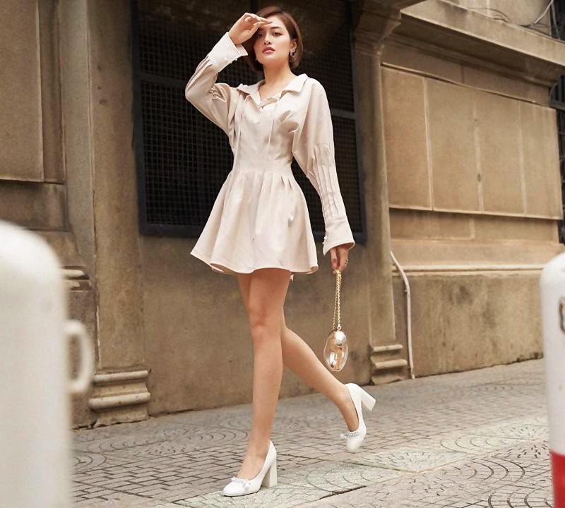 Thùy Anh hóa nàng thơ ngày thu với chiếc đầm thắt eo màu nude, mang giày gót vuông và túi cầm tay nhỏ xinh.