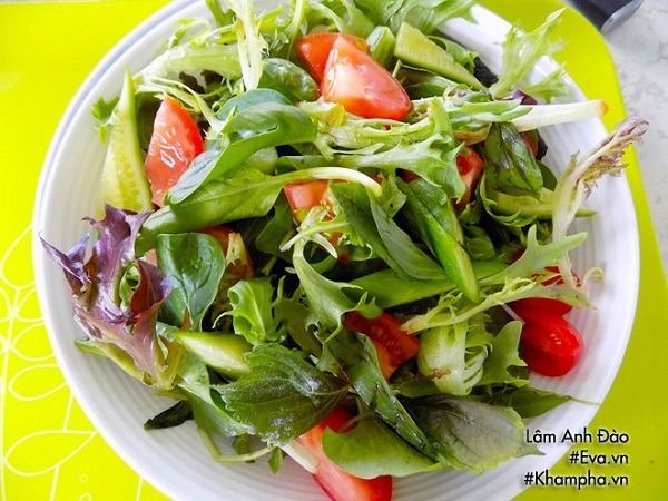 Cuối cùng bạn cho salad cho ra đĩa, thịt gà xếp lên trên, rưới sốt mù tạt và thưởng thức.