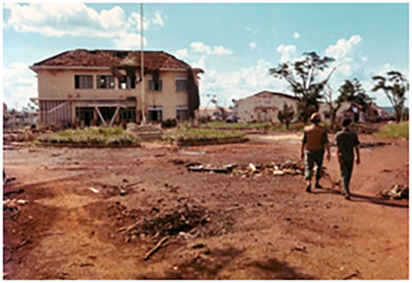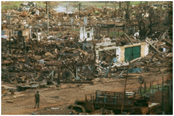 [Hai bức hình trên cho chúng ta thấy rõ đạn pháo binh 130 ly của cộng quân tàn phá đến mức nào? Không thể do bom Mỹ được vì sức tàn phá của bom mạnh hơn rất nhiều, sẽ không có mảnh tường nào đứng vững được nếu bị ăn bom. Hình bên trái: Toà Hành chính Tỉnh Bình Long. Hình bên phải: "Giải phóng là như thế này đây" có khác gì chuyện cướp đất của đồng bào Thủ Thiêm, hay vườn rau Lộc Hưng hôm nay?] (Hình ảnh: Bruno Barbey.)
